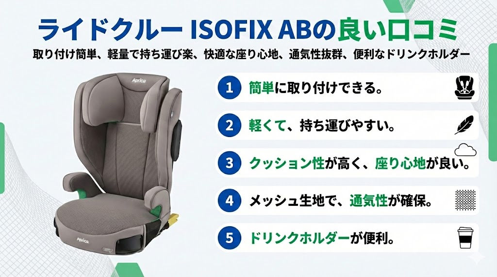 本記事では「ライドクルー ISOFIX ABの口コミ」を集め、良い評判から購入前に確認しておきたい気になる点まで、包み隠さず公開。